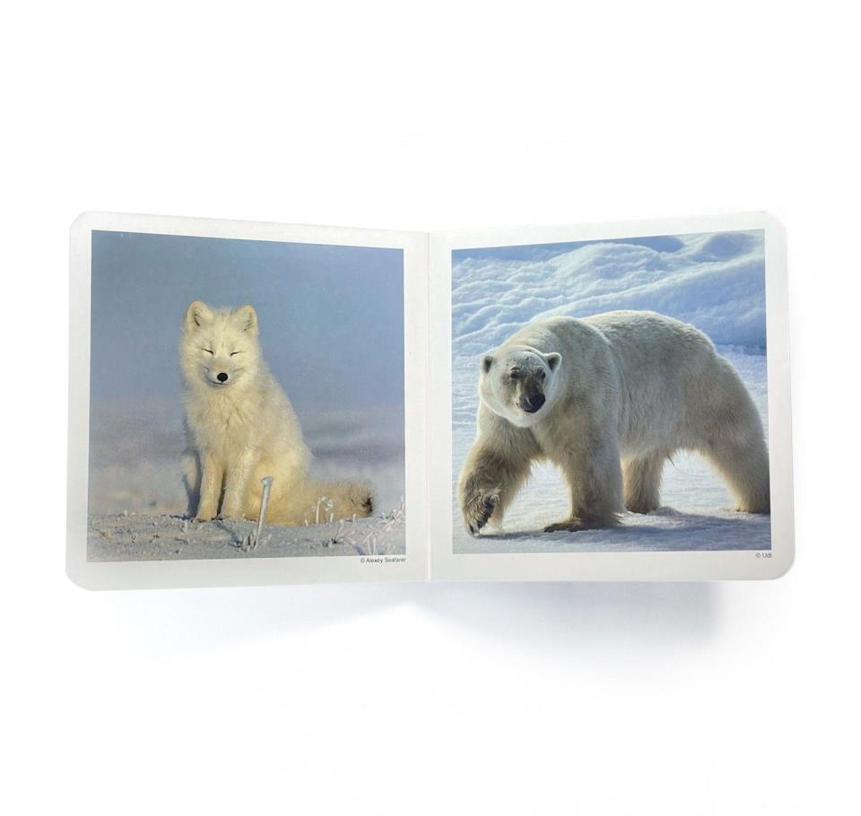 ibro de fotografías de los animales que habitan en los polos.Fotografías individuales de: Oso Polar, Reno, Foca, Búfalo Almizclero, Morsa, Liebre Ártica, Zorro Ártico, Pingüino Emperador, Lobo Ártico, Búho Nival.