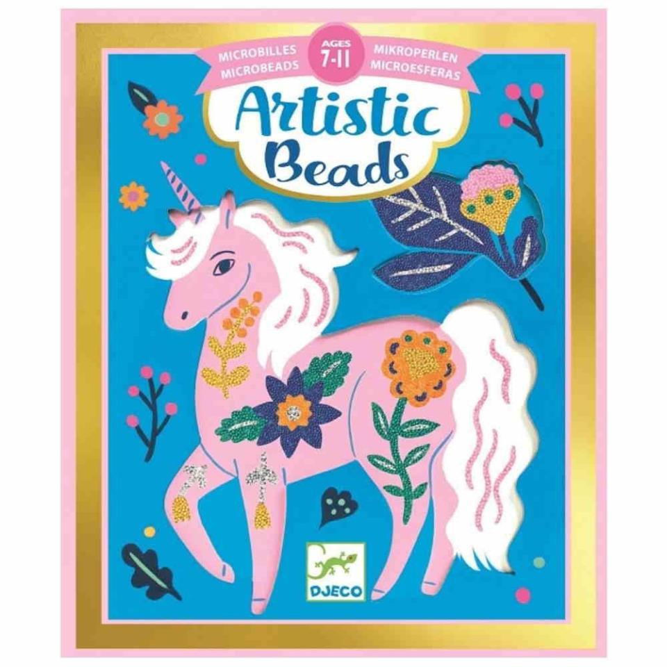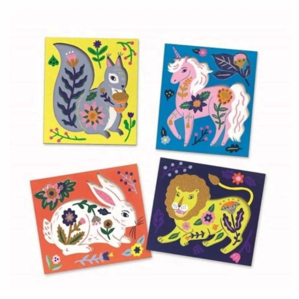 Este kit propone decorar 4 tarjetas ilustradas con microesferas de colores. El niño descubre las áreas adhesivas con la herramienta de plástico y luego aplica las microesferas para completar las ilustraciones