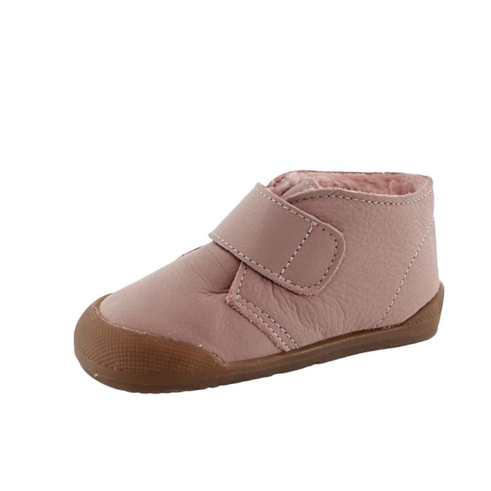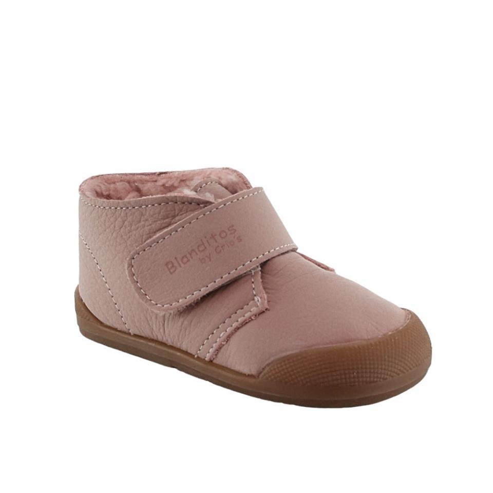 Botines respetuosos de la marca Blanditos, modelo Sansa con borreguillo de color rosa. Están hechos con materiales textiles y piel de la mejor calidad. Son muy cómodos, ligeros y flexibles, y se ajustan a los pies gracias a su cierre con velcro.