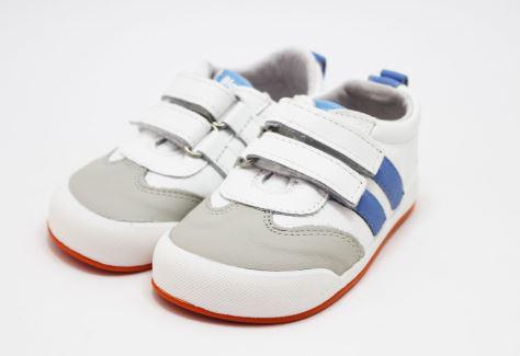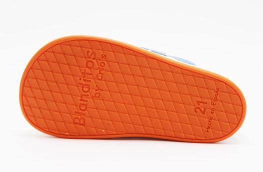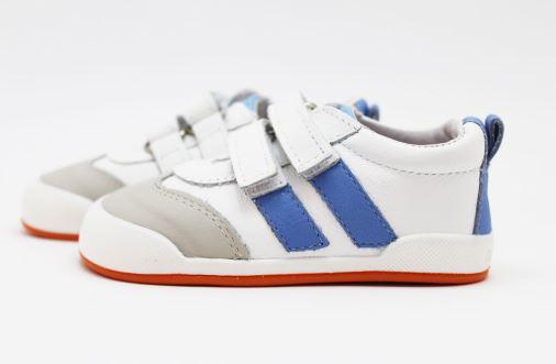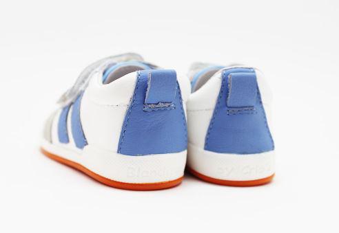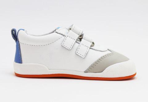 Deportivo modelo MILAN, blanco con rayas laterales en tonos azulón y suela naranja, de la marca Blanditos by Crios. Deportivos respetuosos pensados para cuidar los pies no sólo durante su desarrollo si no también posteriormente al mismo.