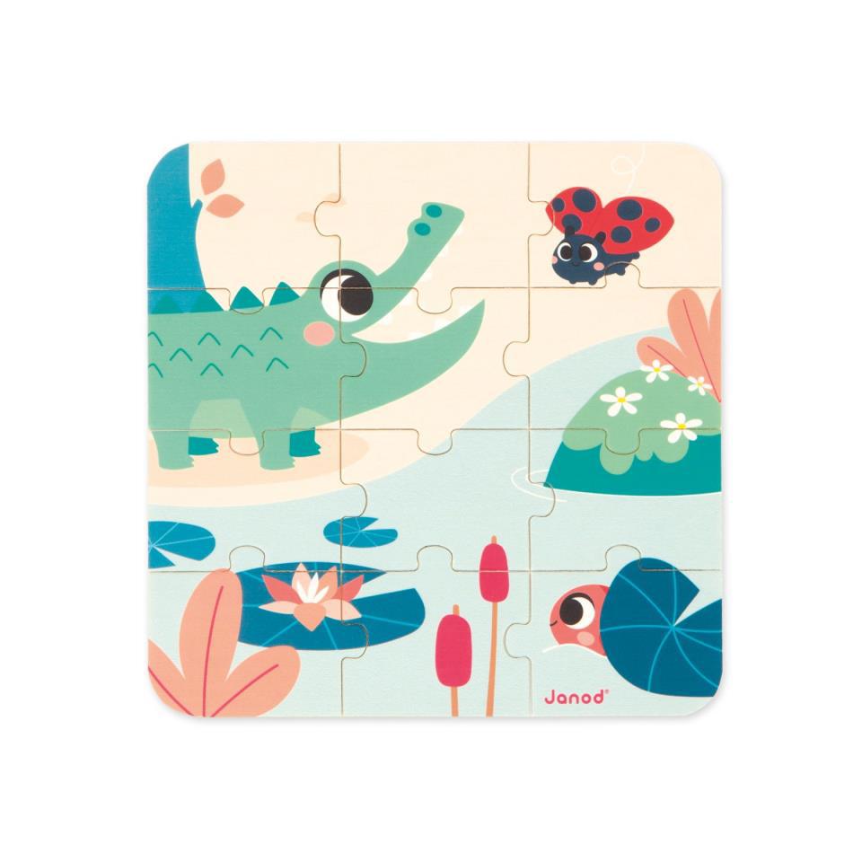 Caja de regalo con 4 juegos destinados a niños a partir de 12 meses, de Janod. Incluye los siguientes juegos: