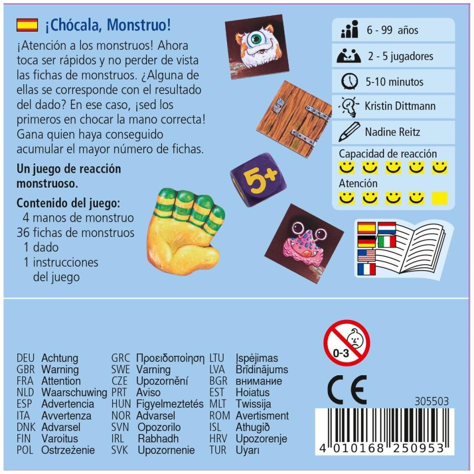 Tenemos que ser rápidos y no perder de vista las fichas de monstruos. ¿Alguna de ellas se corresponde con el resultado del dado? Si es así, los peques tendrán que ser los primeros en chocar la mano correcta. Ganará quien haya conseguido acumular el mayor número de fichas.