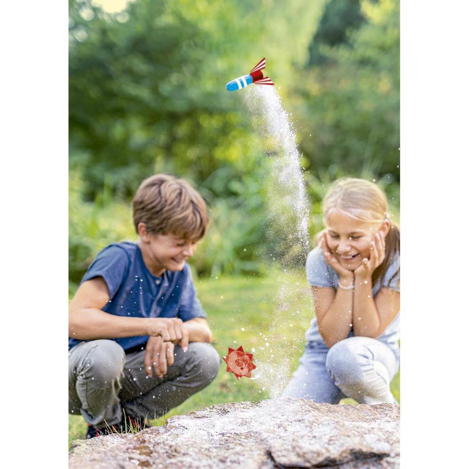 Listo para ir. Como combustible, sólo se necesitan dos ingredientes básicos de la cocina, limpiador ácido y bicarbonato de sodio, y el cohete para salir disparado.