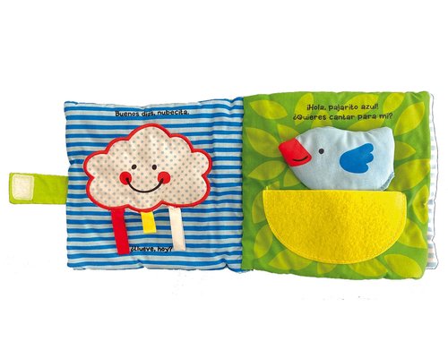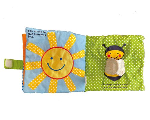Un libro de tela de formato grande y colores vivos con varias texturas para agarrar, elementos sonoros y un pequeño espejo al final para estimular el juego del bebé. íUn regalo ideal para los más pequeños!