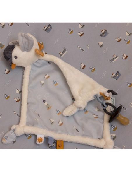 Doudou Sailors Bay de la marca Little Dutch. Tiene una linda gaviota, nudos, etiquetas, y se le puede sujetar un chupete. ¡Personalízalo con el nombre de tu peque!