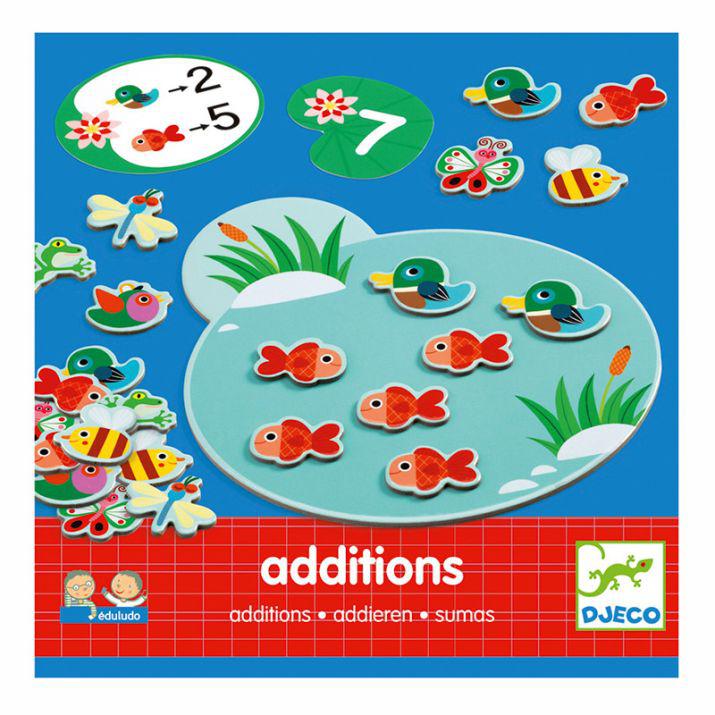 Juego de cálculos muy sencillos para que los más pequeños empiecen con las sumasPara jugar, se coje un carta donde por ejemplo diga que se deben poner 2 patos en el charco y añadir 4 ranas. ¿Cuántos animales hay?
