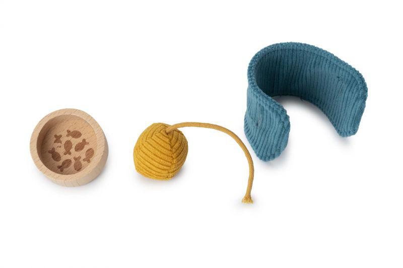 Esta cesta acogedora da la bienvenida al adorable gatito Jeanne, con su chaqueta desmontable, cuenco y ovillo de lana. El niño cuida de ella, acariciándola y alimentándola con atención. Jeanne, a quien le encanta que la mimen, responde con suaves maullidos.