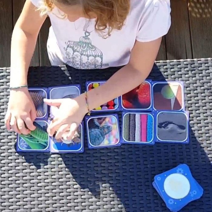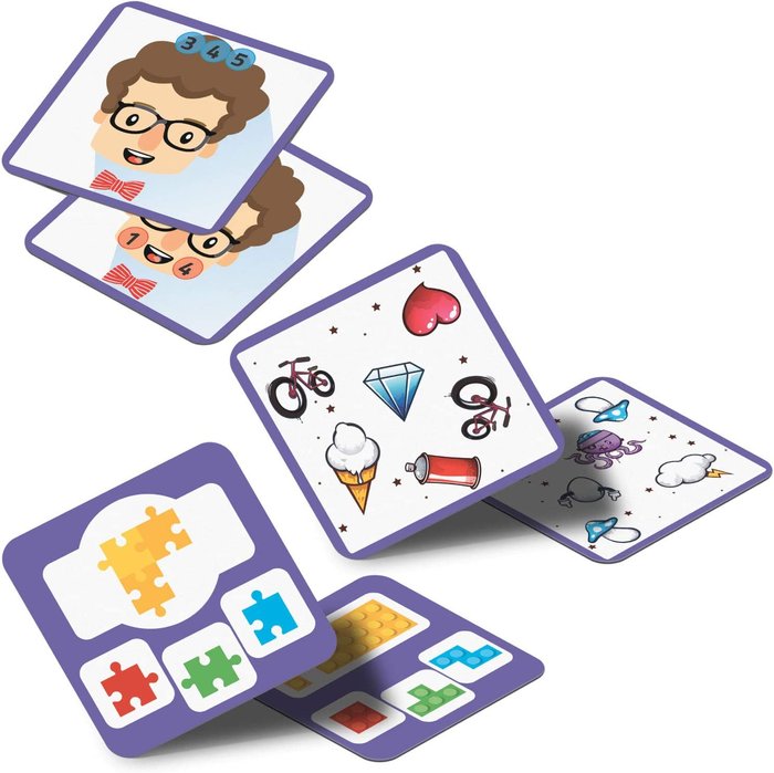 90 CARTAS (74 CARTAS PRUEBA, 6 CARTAS DESAFIO TACTIL, 10 CARTAS TACTILES EN RELIEVE), 6 PUZZLE-CEREBRO (24 PIEZAS) E INSTRUCCIONES.