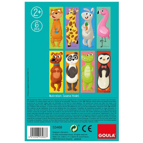 Gira los 6 cubos y haz diferentes combinaciones, aparecerán 8 divertidos animales: un perro, un panda, un gato, una jirafa, un pingüino, un cocodrilo, un conejo y un flamenco. Puedes combinar los cubos para ver los diferentes animales o puedes mezclarlos para crear nuevas imágenes. El color del fondo de la ilustración ayudará a los niños a formar el puzle correctamente.