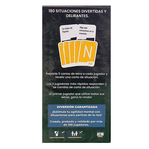 180 cartas de situación para animar las tardes en familia y con amigos. Reparte 5 cartas de letra a cada jugador y revela una carta de situación. Los 3 jugadores más rápidos en encontrar una palabra con sus letras ganan, luego se cambia la carta de situación.