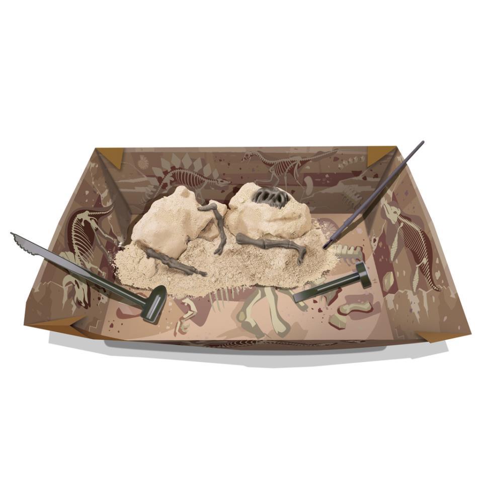 Con este set geológico, ¡los peques se sentirán como verdaderos  paleontólogos! Los peques deberán extraer los huesos del esqueleto de un  Tyrannosaurus Rex de la piedra y después podrán reconstruirlo, creando  un esqueleto de 19cm de largo.