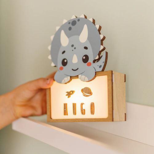 Lamparás quitamiedos con forma de Dinosaurio. Como todos nuestros productos, puedes personalizar la lámpara con el nombre que quieras ya que viene con el kit de letras y símbolos.