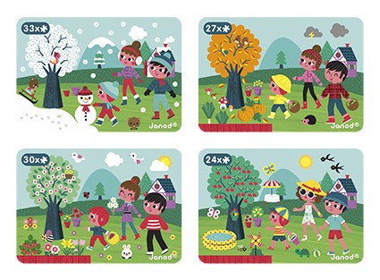 Juego educativo magnético de cartón con la temática de las estaciones. Compuesto por 115 imanes y 4 tarjetas. Una vez se ha abierto el libro, el objetivo del juego es recomponer la escena que indica la tarjeta con ayuda de los imanes.
