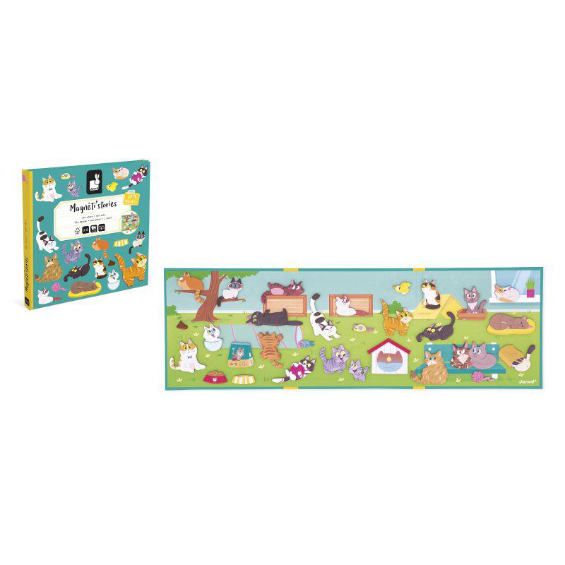 ¡Haz que tu imaginación ronronee con esta banda de gatos! Cada uno en su rincón favorito: en una rama, en una cesta o bien escondido. Gracias a este gran decorado magnético y sus 30 imanes, tu hijo o hija podrá imaginar sus propias historias desplazando a los gatos como le apetezca. Un formato portátil perfecto para poder jugar en cualquier parte una y otra vez. Un juego que estimula la imaginación, la creatividad y la motricidad fina. Juguete magnético de cartón FSCTM. Juguete para niños a partir de 3 años.