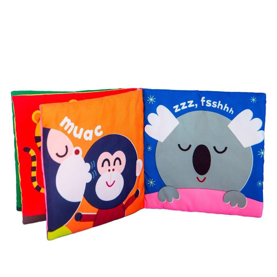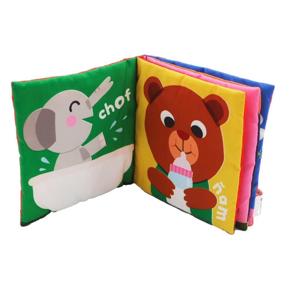 Tap, tap suenan los pies del pequeño tigre, ñam, ñam se relame el osito goloso… Un libro de tela con los sonidos del día a día del bebé, con una nariz que hace ruido en la cubierta. Diseñado para estimular a los bebés con el elemento sonoro y las onomat