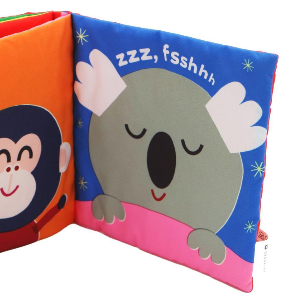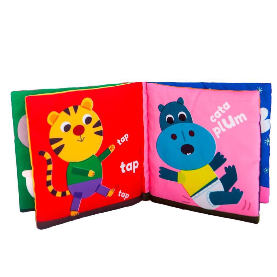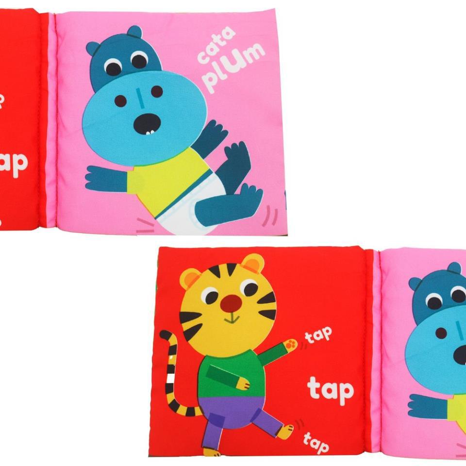 Tap, tap suenan los pies del pequeño tigre, ñam, ñam se relame el osito goloso… Un libro de tela con los sonidos del día a día del bebé, con una nariz que hace ruido en la cubierta. Diseñado para estimular a los bebés con el elemento sonoro y las onomatopeyas que representan los sonidos de las acciones cotidianas, y con el elemento visual de colores vivos y formas grandes.