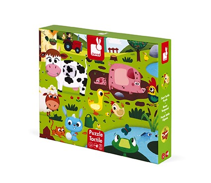 Puzle gigante con piezas de cartón rígido texturizado (pelo de la vaca, de la oveja, imitación de la cola del conejo, cerdo, pato, cresta del gallo, rana). Ilustraciones en colores suaves y adaptadas para niños sobre el tópico de la granja. Contenido: un poster a utilizar como modelo. Número de piezas: 20. Materiales utilizados: cartón.