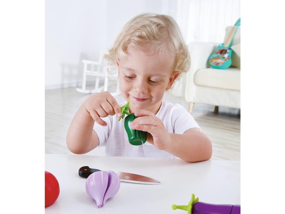 ¡No hay nada más sano que las verduras frescas! Recorta los tallos y luego utiliza el cuchillo de juego para cortar el pimiento verde, el tomate y mucho más. Las verduras se mantienen unidas con lengüetas autoadhesivas y se separan para mayor realismo.