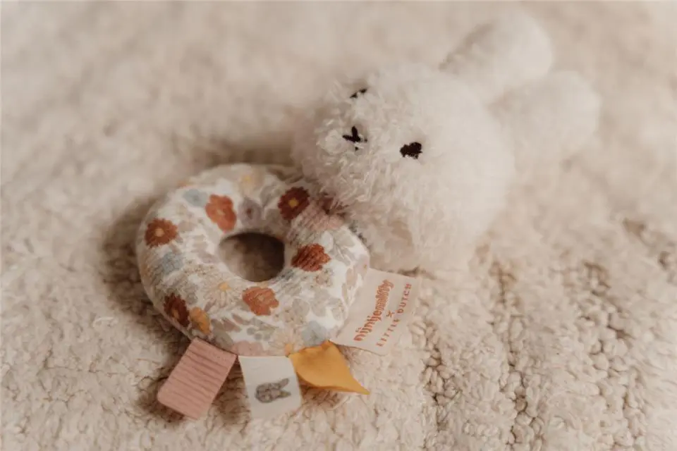 Cada vez que muevas a este miffy, un sonido de traqueteo recompensará tus esfuerzos. El sonajero en forma de anillo está decorado con las pequeñas flores vintage de Little Dutch y está diseñado para que las manos pequeñas lo agarren fácilmente. Hay etiquetas pequeñas para explorar y un simpático miffy en la parte superior para jugar.