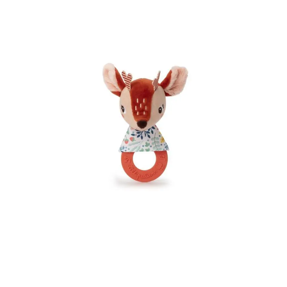 Cuando empiezan a salir los primeros dientes del bebE, Stella corre para ayudar. Su suave anillo de denticiOn alivia el dolor y su alegre sonajero distrae al bebe.