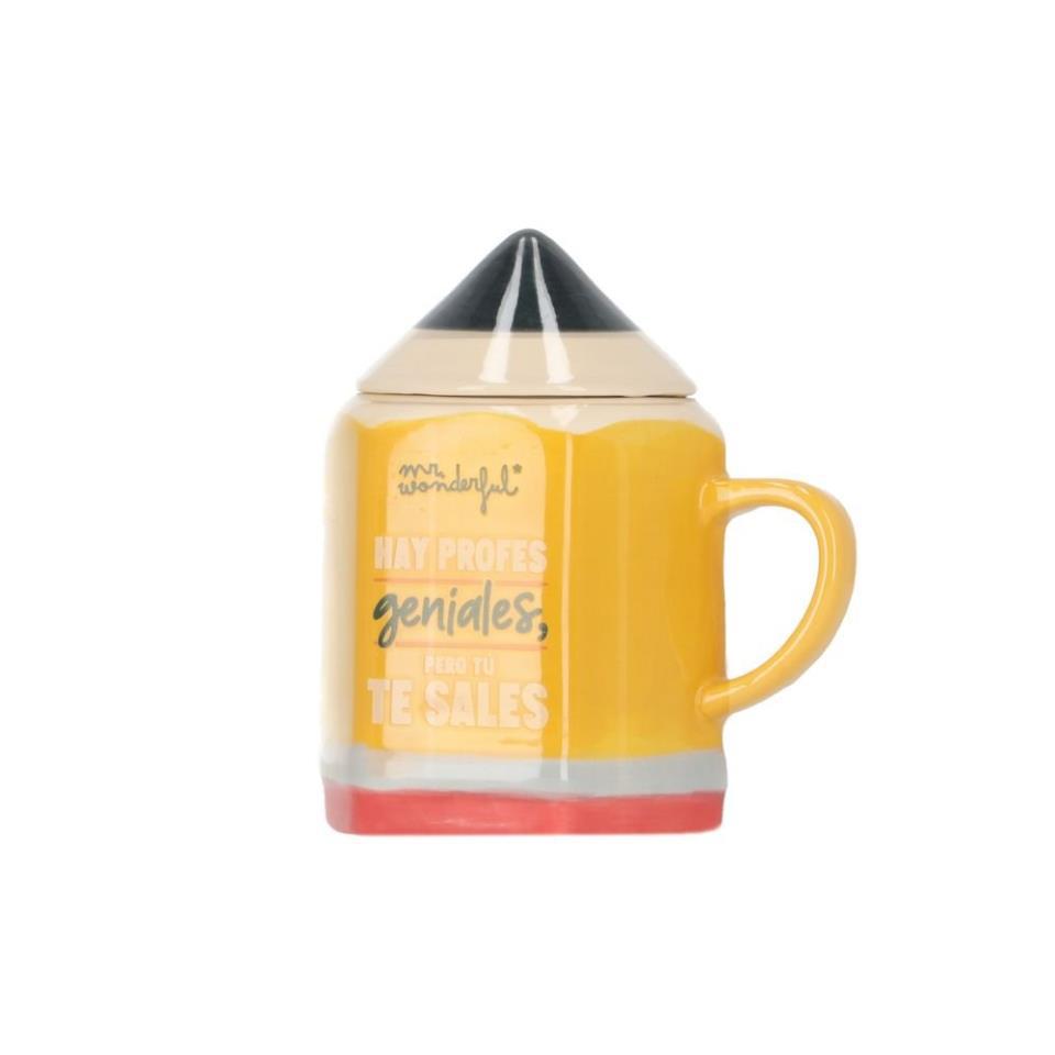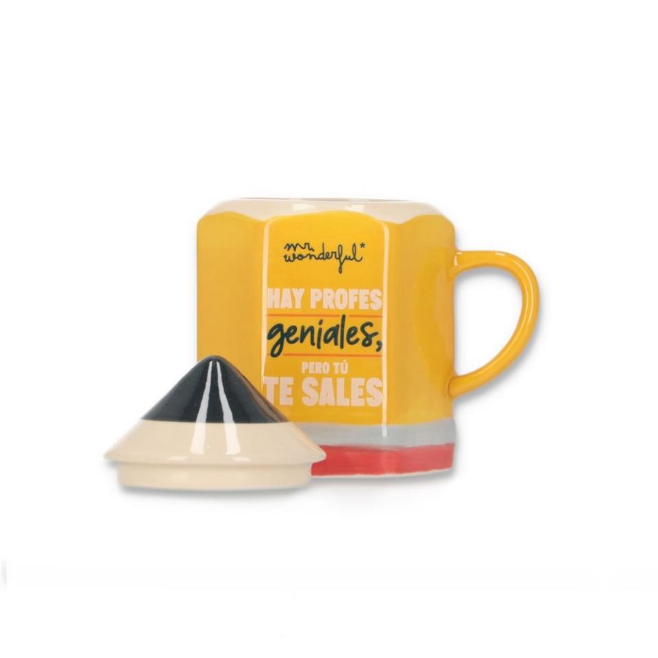 Taza realizada en cerámica con mensaje dirigido a profes, hombres o mujeres. La taza en sí tiene forma de lápiz y lo que sería la punta del lápiz es en realidad una tapa (también de cerámica) para la taza. Capacidad: 330 ml Indicaciones: apta para microondas y lavavajillas, aunque se recomienda lavarla a mano para que el diseño permanezca intacto durante más tiempo.