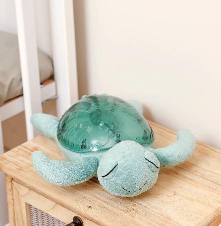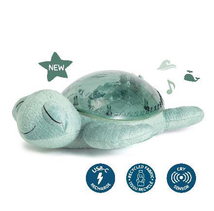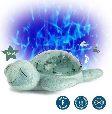 Tranquil Turtle™ Recargable – Verde es una simpática tortuga, fabricada con fibras 100% recicladas de botellas de plástico, que brilla con una suave luz y proyecta olas oceánicas en movimiento en el techo del dormitorio, gracias a un exclusivo mecanismo p