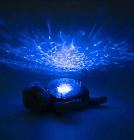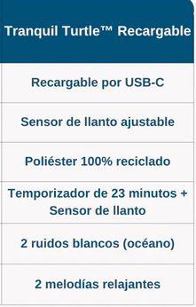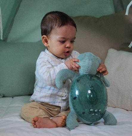 La luz nocturna Tranquil Turtle™ Recargable – Verde calma al bebé y tranquiliza a los niños que tienen miedo a la oscuridad. Suave peluche durante el día, se transforma en luz nocturna por la noche. Su efecto de luz submarina es mágico, gracias a la proyección de olas en movimiento. Melodías y ruidos blancos tranquilizarán a los más pequeños para llevarlos camino del sueño. Dispone de 4 sonidos relajantes: melodía subacuática, melodía tranquila, canto de ballena , olas del mar (ruido blanco) y 6 niveles de volumen ajustables. Un dispositivo inteligente Sensor de llanto, con sensibilidad ajustable, se activa automáticamente al primer llanto del bebé.