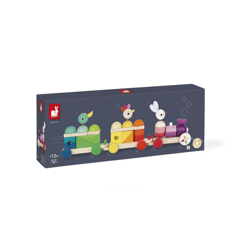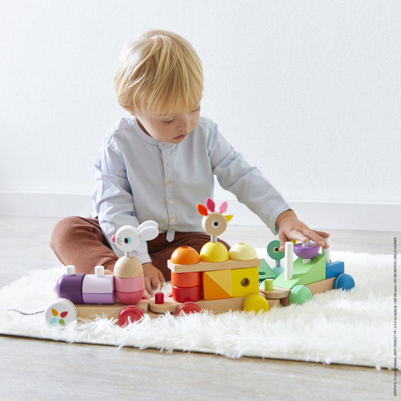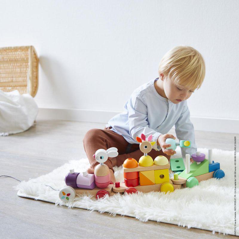 Juguete de madera. Pintura al agua. Para niños de 12 a 36 meses. Juguete 2 en 1: Juguete para pasear y desarrollar la motricidad del bebé. Juego de construcción con 25 piezas que deben apilarse. Se trata de un juego de actividades de motivación que permitirá al niño desarrollar su coordinación visual y destreza manual. Un juguete a pleno color, con unos tonos armoniosos.